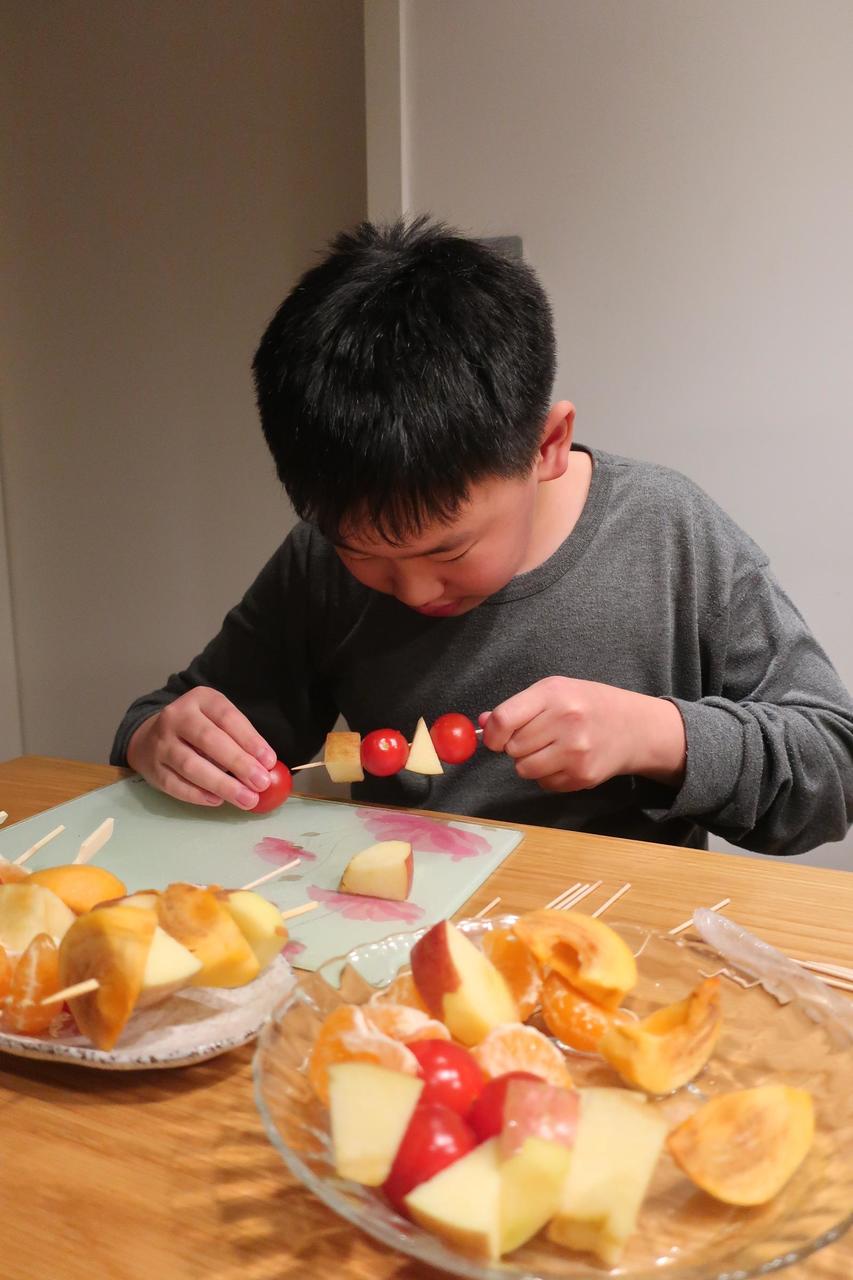 꼬치에 과일조각들을 끼워서 맛있는 과일꼬치을 준비해요.