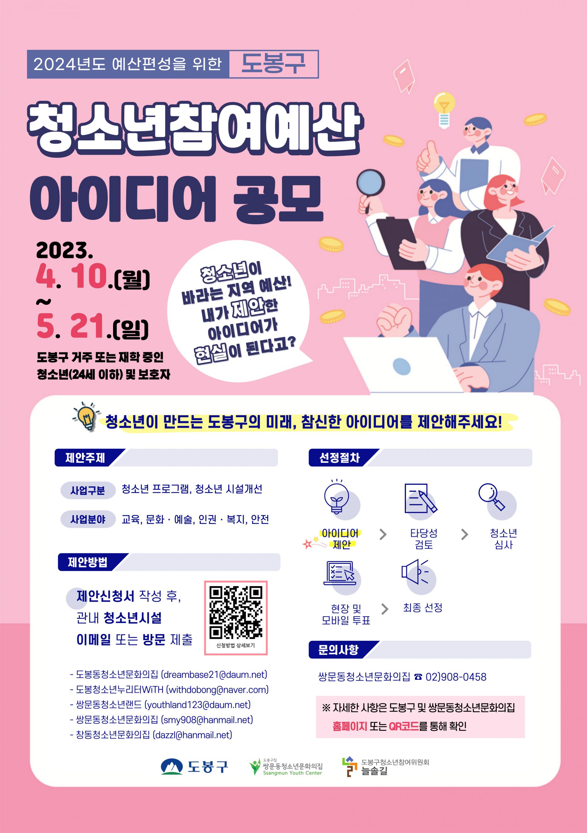 청소년이 필요한 사업을 직접 제안하고 결정하는 『도봉구 청소년참여예산 아이디어』 를 공모하오니 많은 참여 바랍니다.